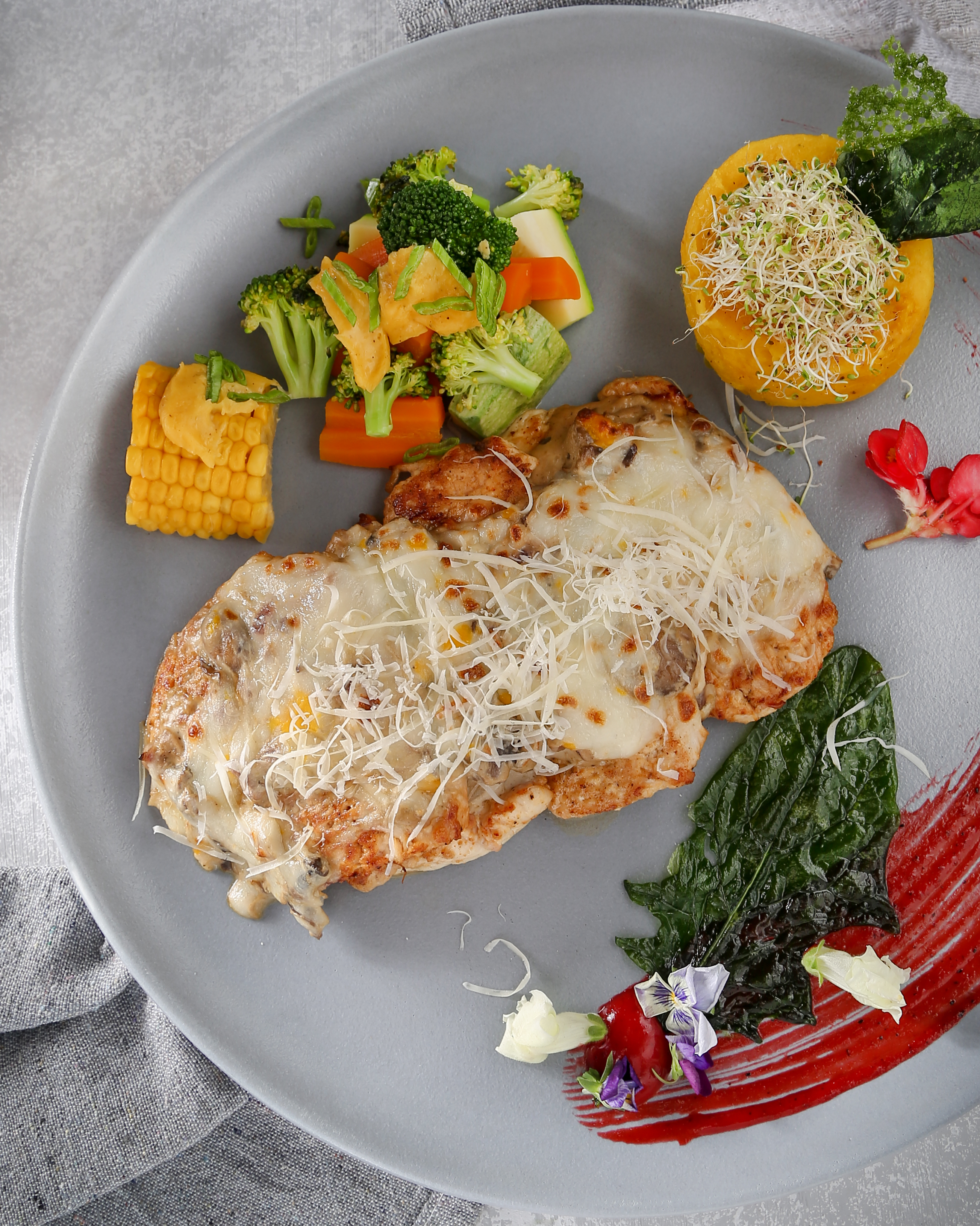 سينه مرغ گريل شده به همراه سس اسفناج ،خامه و پنير چدار