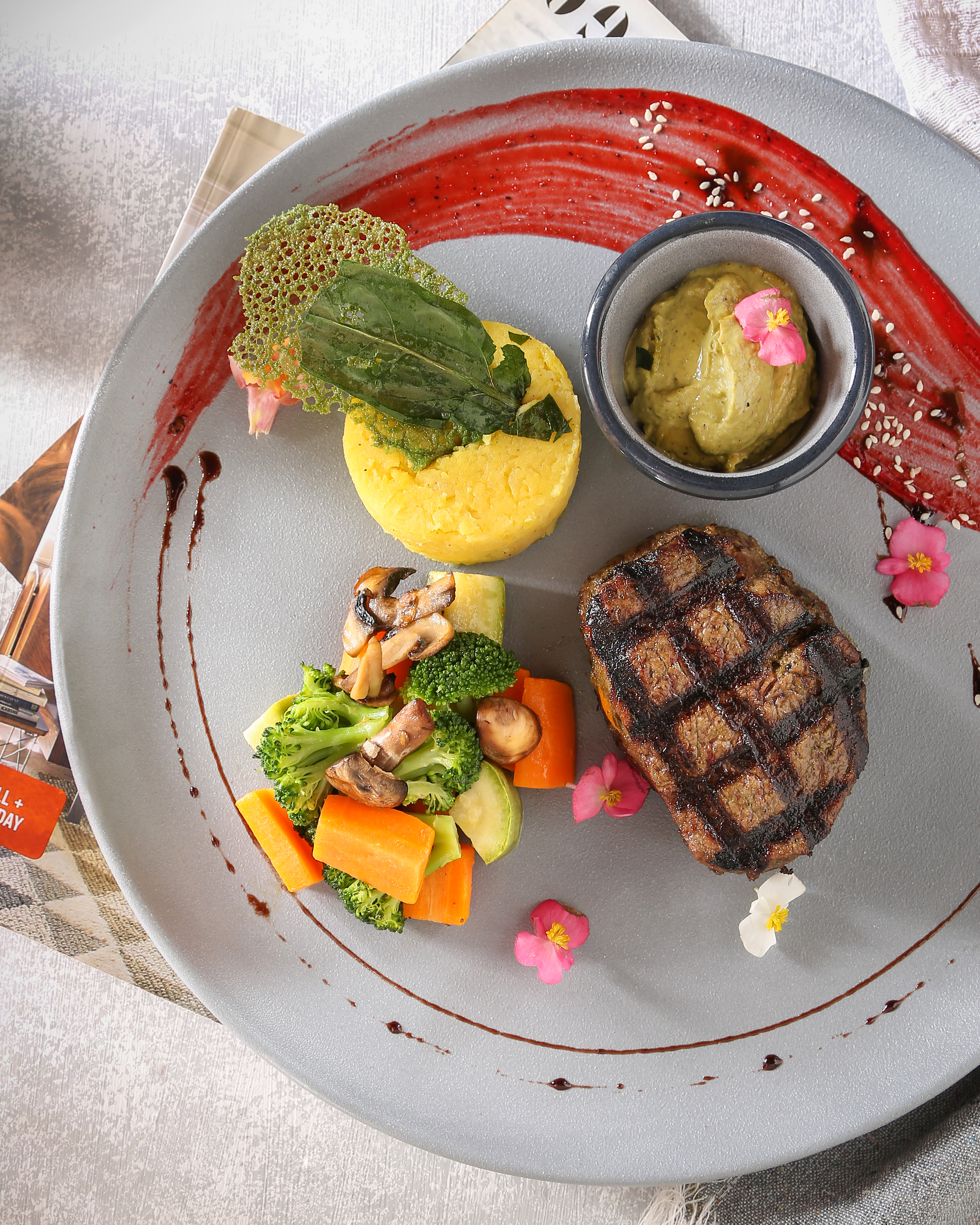فيله گوساله ،سبزيجات تازه،سيب زميني و سس روکولا