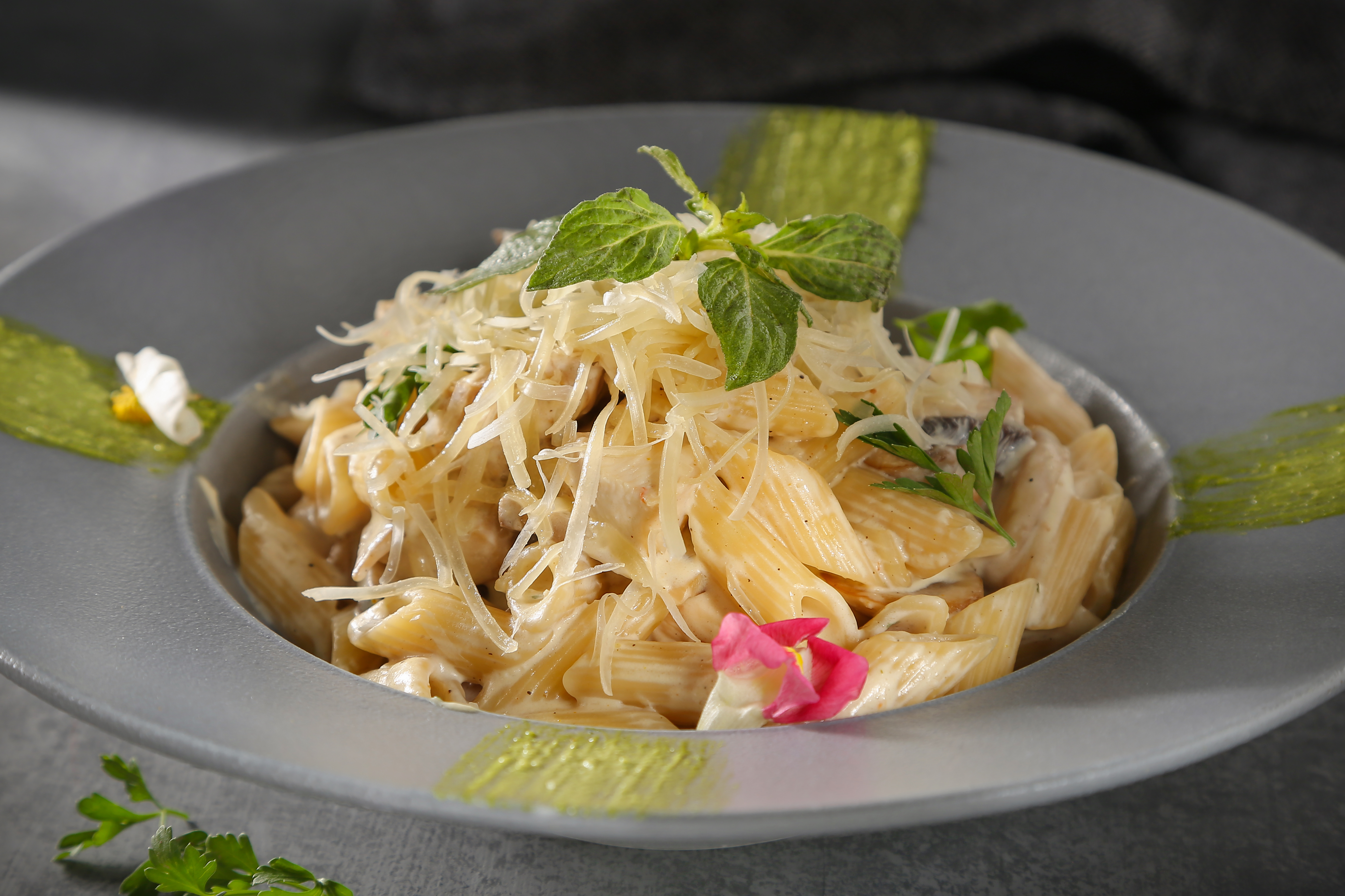 پنه،مرغ مزه دار شده ،قارچ ،سس الفردو ،پنير پارمسان و سير تازه