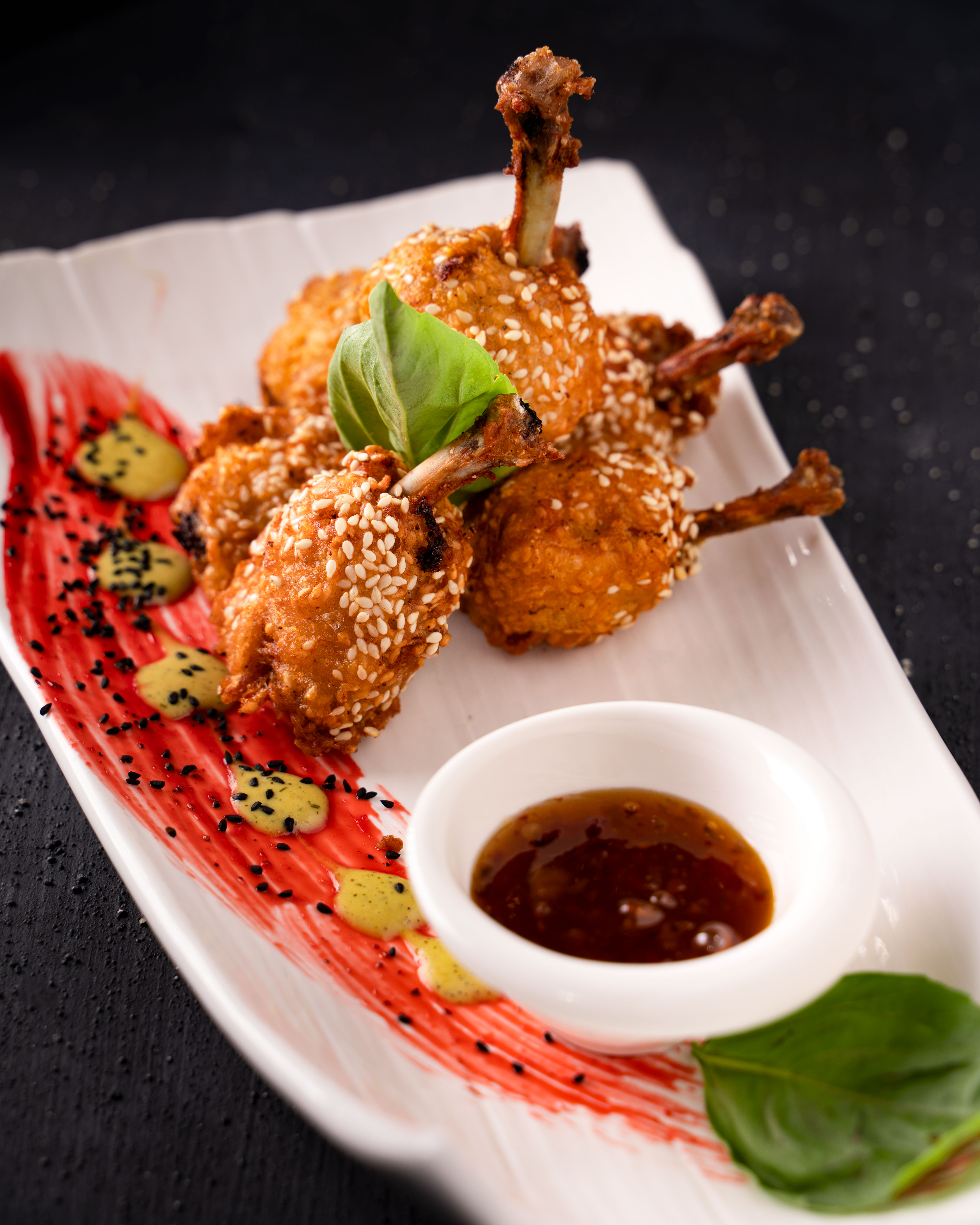 شش تکه بال مرغ اسپايسي به همراه کنجد و سس تايي