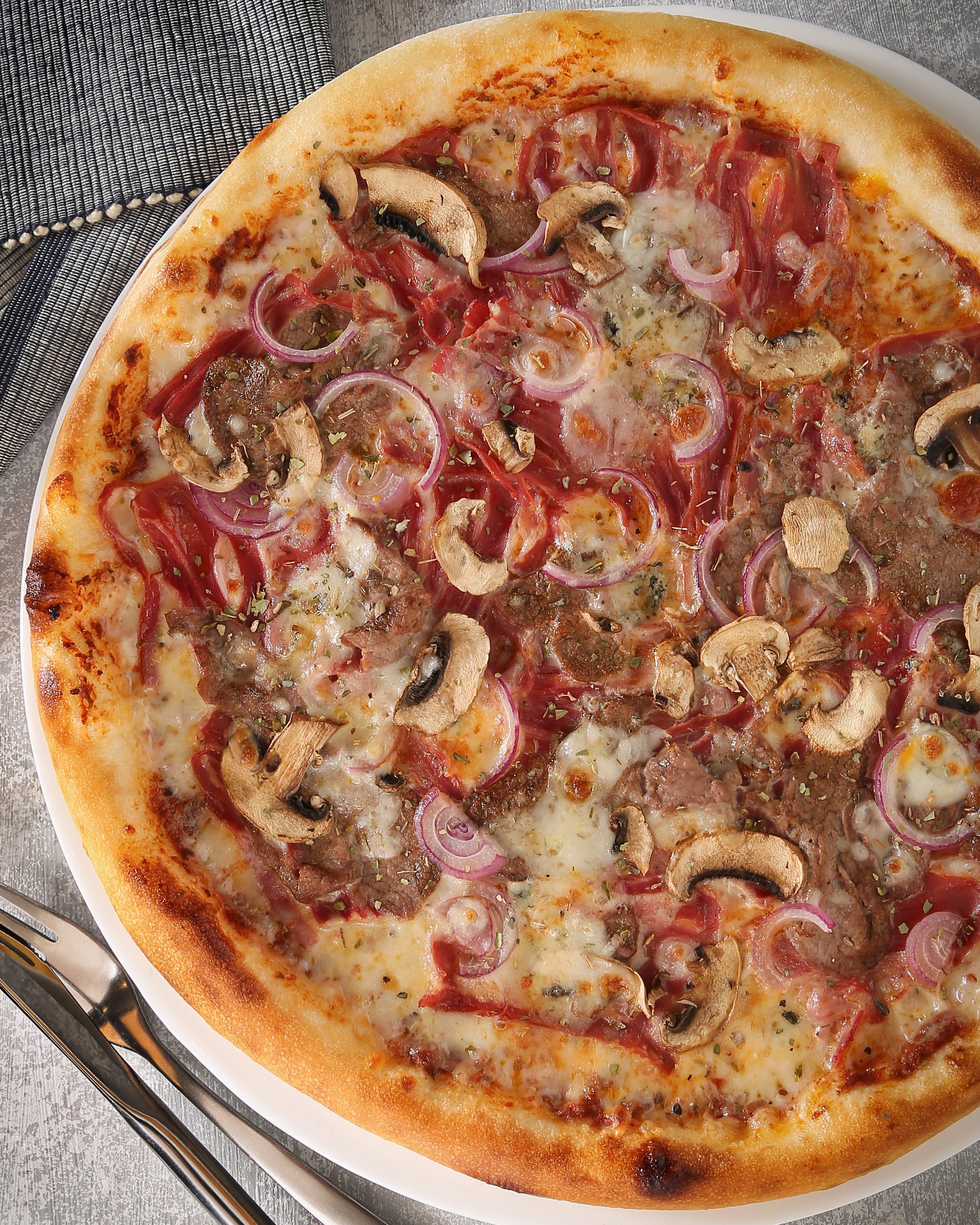 فيله گوساله ،بيکن،سس مخصوص ،قارچ،بلوچيز،پياز