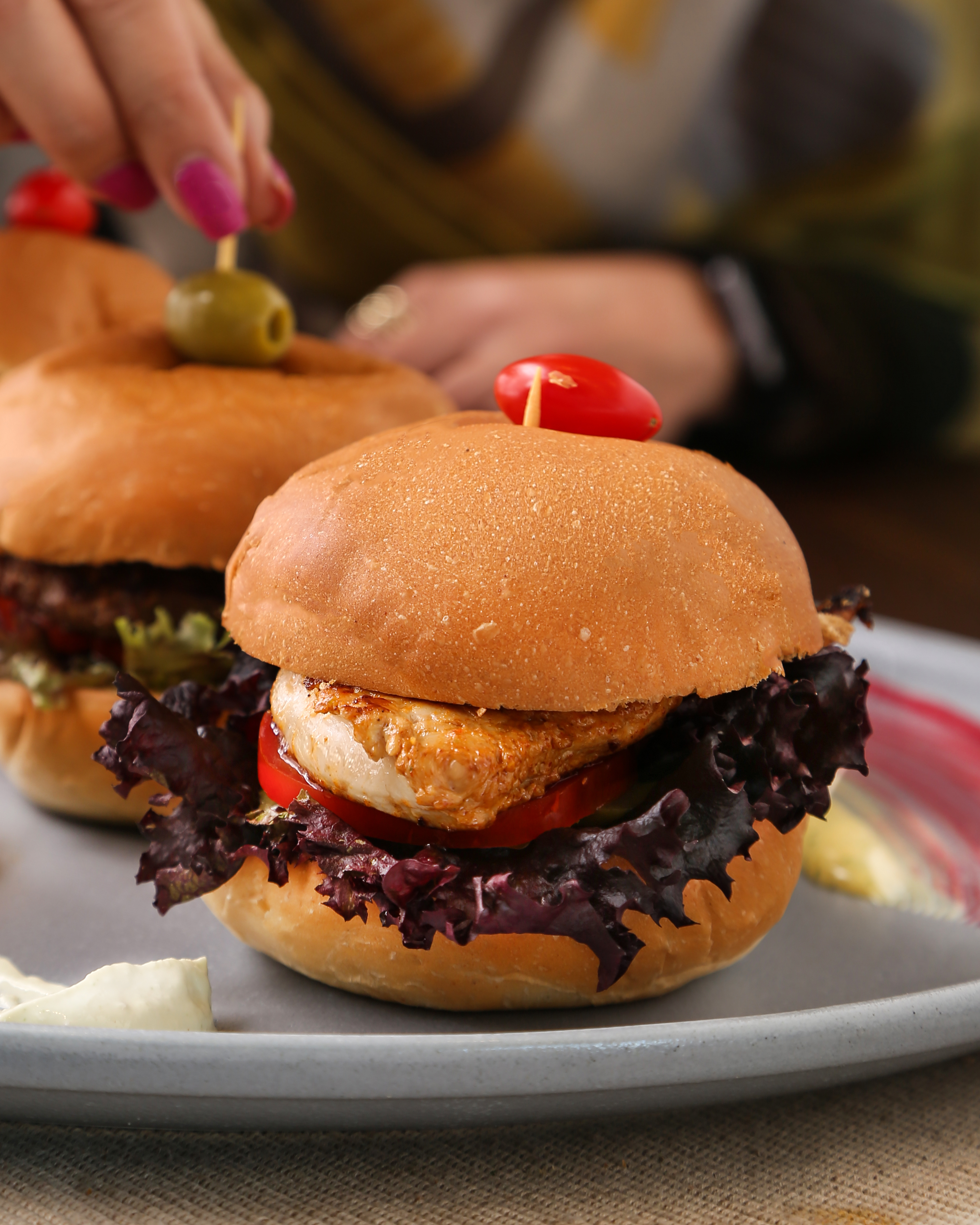 دو عدد چيکن برگر به همراه کاهو ،گوجه ،خيارشور،سيب زميني و سس پستو